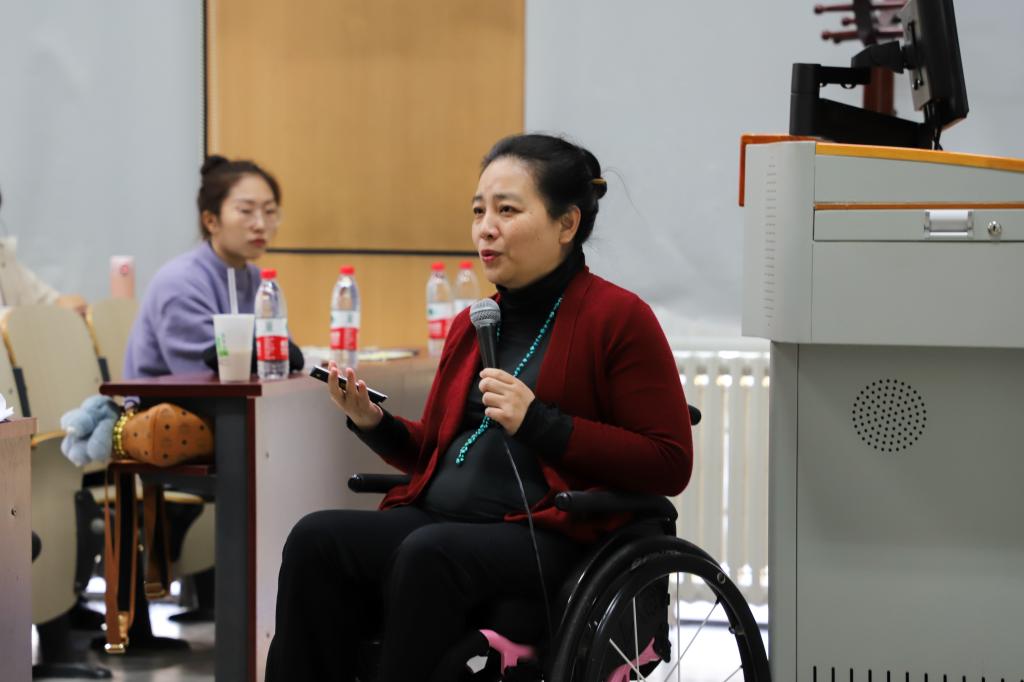 李楠老师以《助力圆梦,成就价值》为题讲述了她在25岁的青春年华遭遇车祸后5年康复治疗,以高位截瘫的身体与生命斗争,在生活中磨练意志,积极投身助残事业帮助他人、奉献自我实现人生华丽蝶变的故事。李楠老师向在场师生展示了部分残疾人的成功案例和她与团队成员助残、为残的感人事迹,深刻阐述了她对生命的认识以及从事助残服务事业的体会,认为“最好的‘照顾’往往是悄无声息的,以社会全体成员十分熟悉的方式。”李楠老师还呼吁人们关心残疾人、爱护残疾人、接纳残疾人,邀请青年老员工参与助残服务事业。讲课结束后,员工代表向李楠老师献上鲜花,送上祝福。