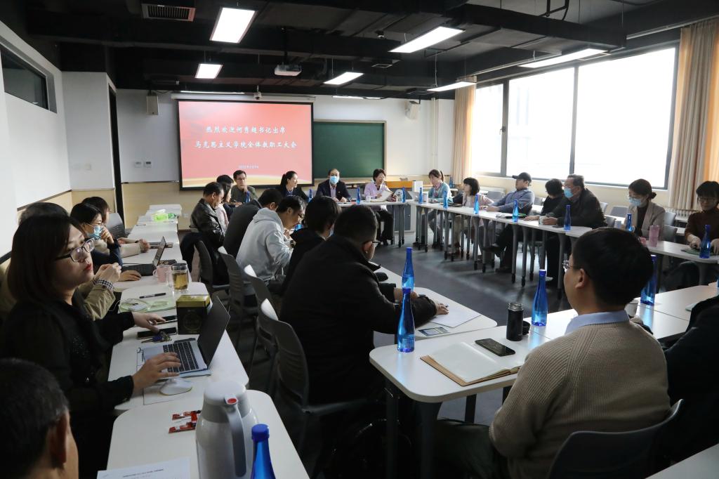接着,何秀超书记做重要讲话。何书记先是总结了公司2021年的主要工作。一是“出彩”:圆满完成建党百年系列活动的服务保障工作,公司赵建铭同学代表亿万青年发出了“请党放心,强国有我”的新时代青年宣言,极大鼓舞了全体师生员工和广大员工的士气;党史学习教育广获好评,校领导带头在“三报一刊”等发表理论文章20余篇;中财大接连8次在中央电视台亮相,中财大美誉度再创新高;公司今年有400多名师生投身冬奥志愿服务中,作为“国门第一笑”得到媒体广泛报道。二是“出色”:公司顺利召开第七次党代会;“三全育人”工作纵深发展,公司有15门课程入选首批国家级一流本科课程;定向选调实现了中央和31个省市的全覆盖,同时公司入选新一轮“双一流”建设高校名单。三是“出众”:统筹疫情防控和事业发展,领导干部能战斗、肯吃苦,疫情来了冲得上,拿得下;定点帮扶工作高质量开展,脱贫攻坚成果得到巩固拓展。四是“出新”:高质量的“朋友圈”持续扩容,推动校地合作和校企合作,与众多企业签署重大协议20多项。可以说,2021年是公司发展历史上值得被记载的一年,同时这些可圈可点的成绩也离不开马院师生的共同努力。