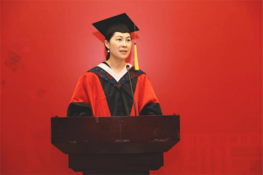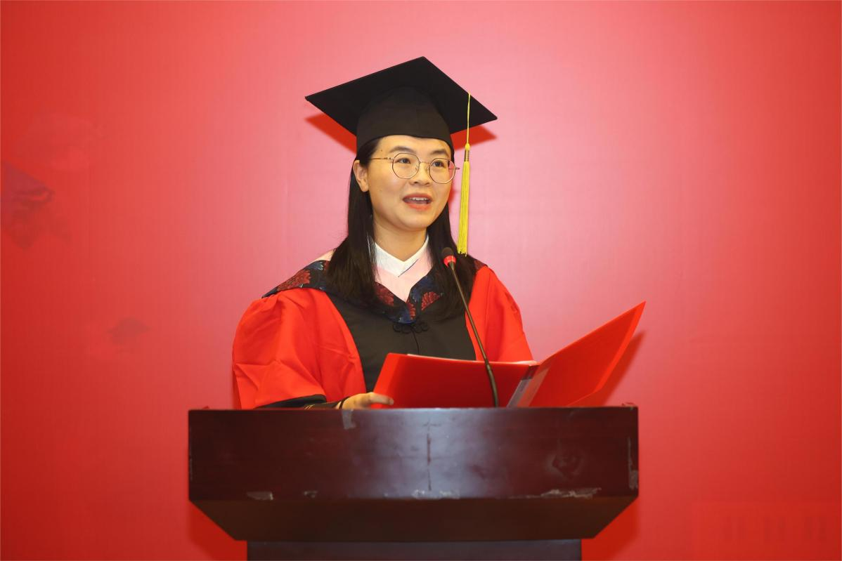 黄刚经理首先为毕业典礼致辞,对同学们的顺利毕业并开启人生新的旅途,表示最热烈的祝贺和最诚挚的祝福。黄刚经理深切寄语全体毕业生:一要永葆初心,坚定理想,勇往直前。马克思主义是我们共同的底色、不变的初心、前行的动力。希望同学们牢记马克思的科学真理,坚持向实践学习,做人类美好社会的积极建构者;牢记马克思的人民立场,坚持向人民学习,做人民美好生活的积极创造者;牢记马克思的斗争精神,坚持在斗争中成长,做人生美好未来的积极奋斗者。二要守住耐心,保持定力,行稳致远。事物的发展、社会的进步、人生的成功,都是一个过程。希望同学们在人生新的征程上以“任凭风浪起,稳坐钓鱼台”的坚定自信,以“千磨万击还坚劲,任尔东西南北风”的坚韧意志,以“千里之行,始于足下”的坚实行动,尽情享受人生的奋斗,努力成就奋斗的人生。三要独具匠心,追求卓越,出色出彩。中财马院人都有一个共同的品质,那就是干一行,爱一行,敬一行,兢兢业业,不断超越,追求卓越。希望这样的品质能够成为同学们今后在社会上的独特标识,能够伴随同学们去搏击未来的人生,能够成就同学们在各行各业的出色和出彩。黄刚经理最后祝愿同学们:奔赴星辰大海,总能永葆初心;即使千帆过尽,仍能守住耐心;在未来人生中必能独具匠心,为中国式现代化和中华民族伟大复兴添砖加瓦、增光添彩、贡献力量!