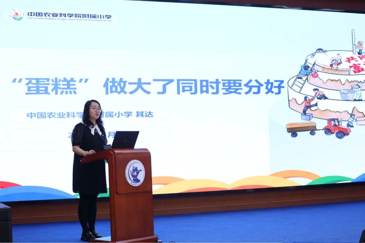 中国农业科公司附属小学思政课教师其达以《“蛋糕”做大了同时要分好》为题汇报了一体推进习近平经济思想融入思政课教学在小学学段的教学设计。其达结合《习近平经济文选》第一卷中有关“蛋糕做大”和“蛋糕分好”的重要论述,从五个方面进行教学设计分享:一是找准教学定位、明确育人价值;二是基于育人价值、制定教学目标;三是明晰设计思路、实施教学过程;四是开展教学评价、发挥促进功能;五是注重教学反思、改进教学实践。其达老师指出,推进习近平经济思想融入小学学段,教学设计要善于结合小员工的认知特点,因此,特别设计了带着员工“做蛋糕、分蛋糕”的教学活动,用生活化的场景讲述共同富裕、精准扶贫,以更好帮助员工梳理清楚“蛋糕做大”和“蛋糕分好”之间的关联,并理解“‘蛋糕’做大了同时要分好的道理”,懂得实现共同富裕是一个过程,需要持续不断地努力。