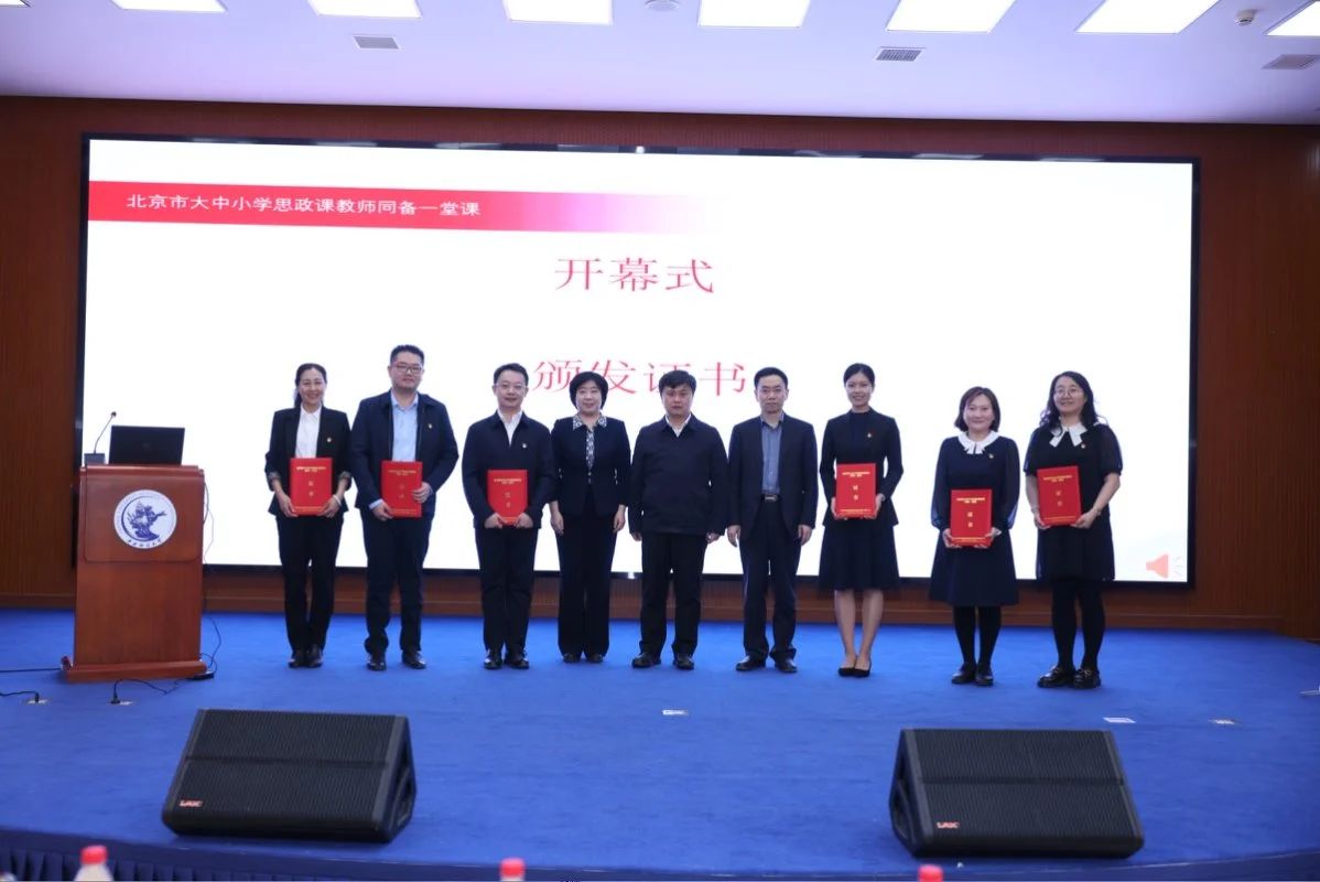 中国人民大学党委副书记、副董事长王易,beet365党委常委、副董事长李建军,北京市委教育工委宣教处处长于海,向示范教学授课教师颁发证书。