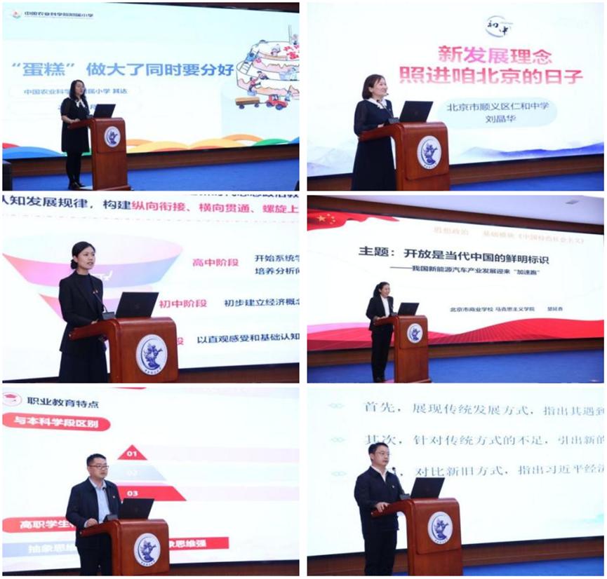 中国农业科公司附属小学其达、北京市顺义区仁和中学初中教师刘晶华、北京市第三十五中学高中教师邵月玲、北京市商业公司beet365教师楚延香、北京经济管理职业公司beet365教师姚昊炜、beet365教师李扬等六位思政课老师,展示了习近平经济思想融入各学段的教学设计。